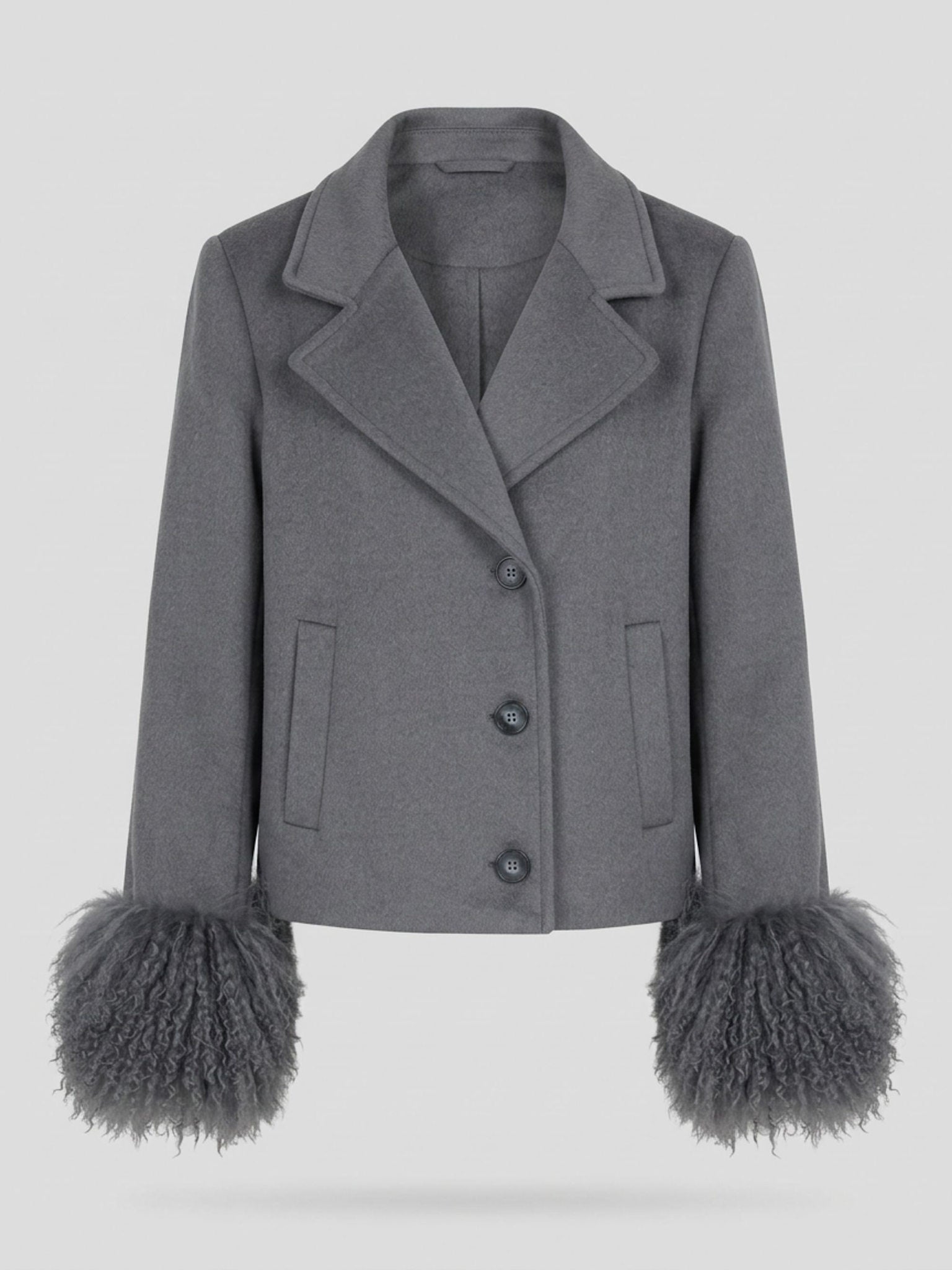 What truly sets this piece apart are the soft mongolian fur cuffs – a textural contrast that adds a playful yet luxurious touch. Whether worn open for a relaxed daytime look or for sleek evening polish, this jacket elevates any outfit with minimal effort.