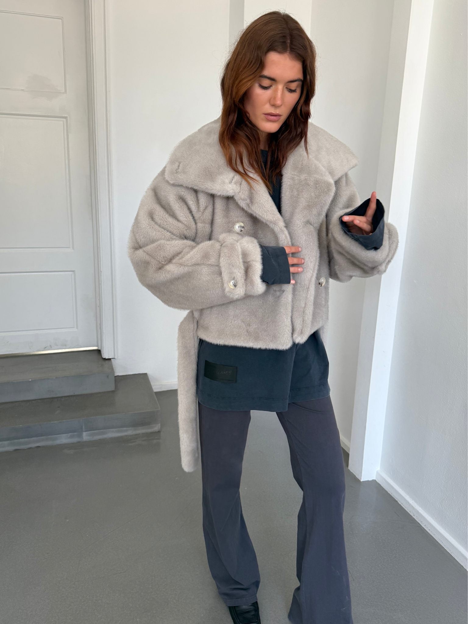 The Atlas Faux Fur Jacket is designed with an oversized silhouette and a striking high collar, creating a bold, statement-ready look. It features a classic button closure, adjustable sleeve straps, and two discreet welt pockets for practical elegance.