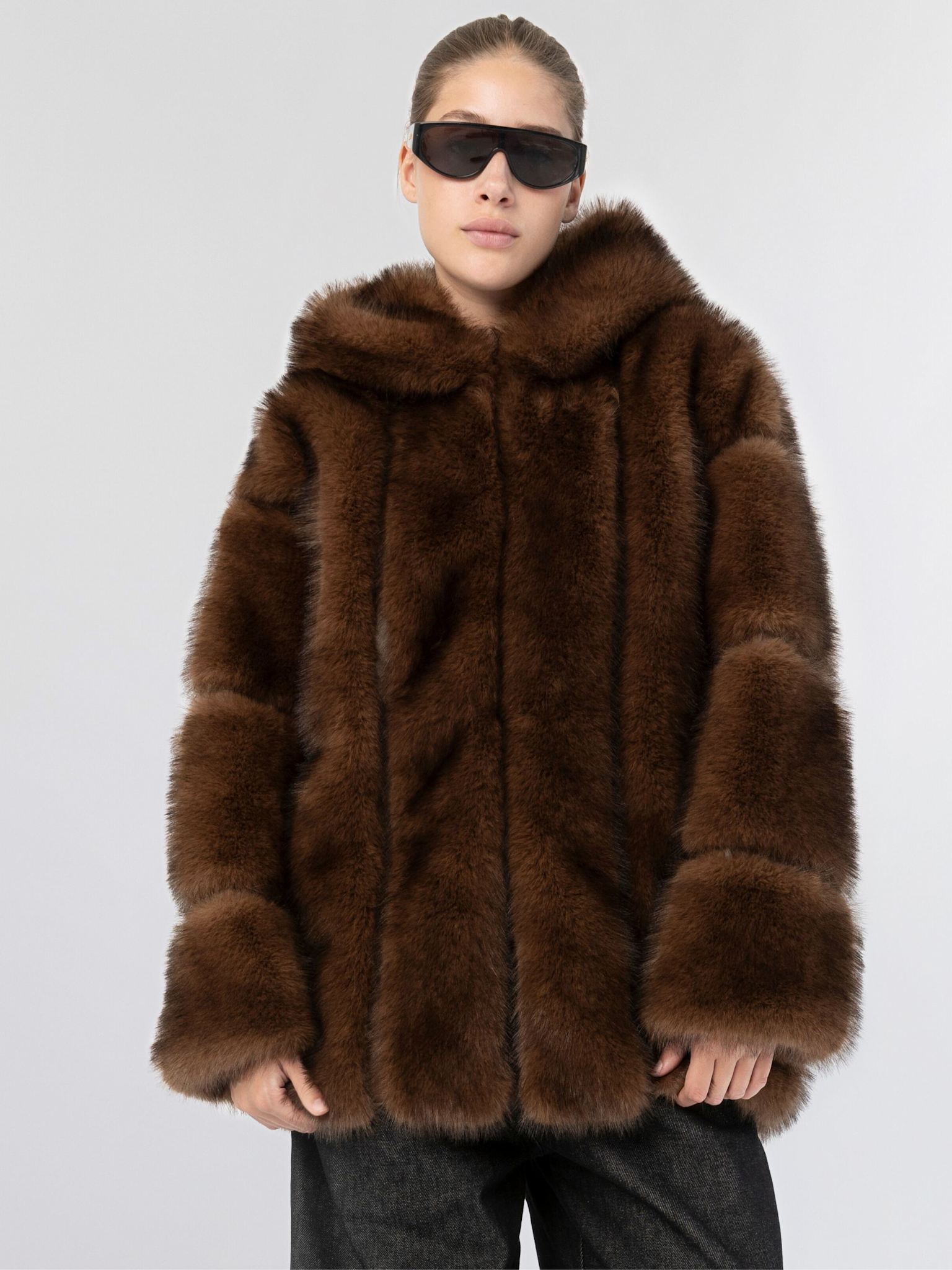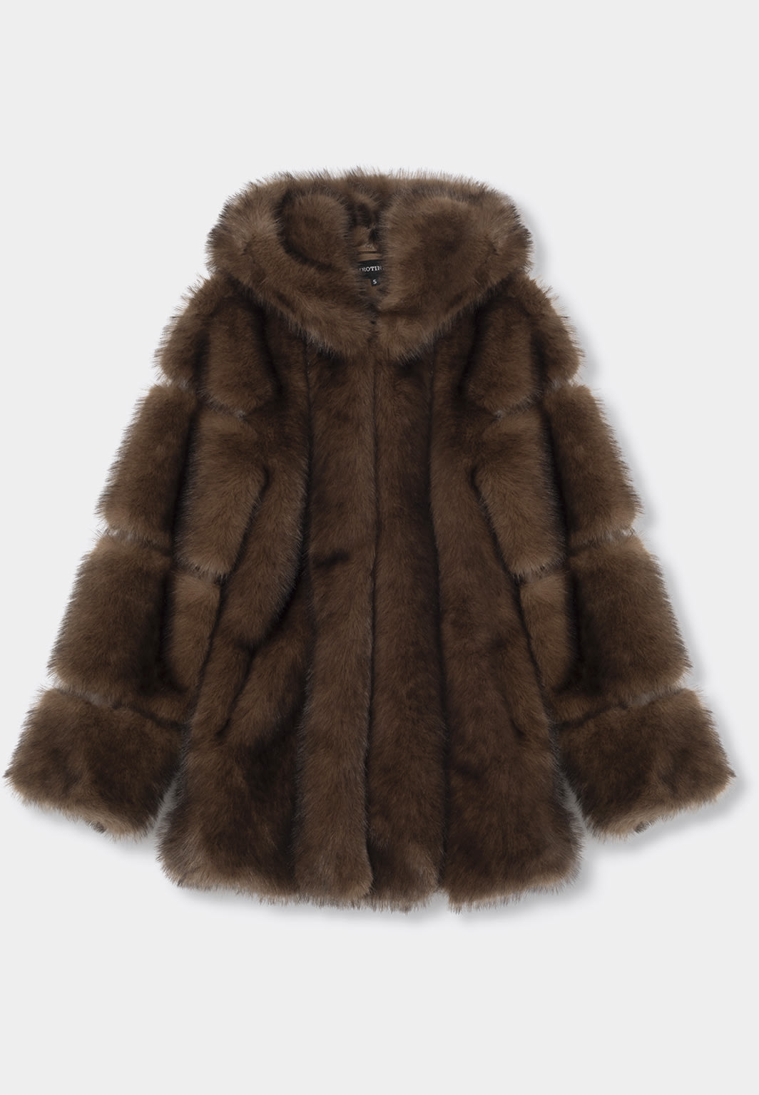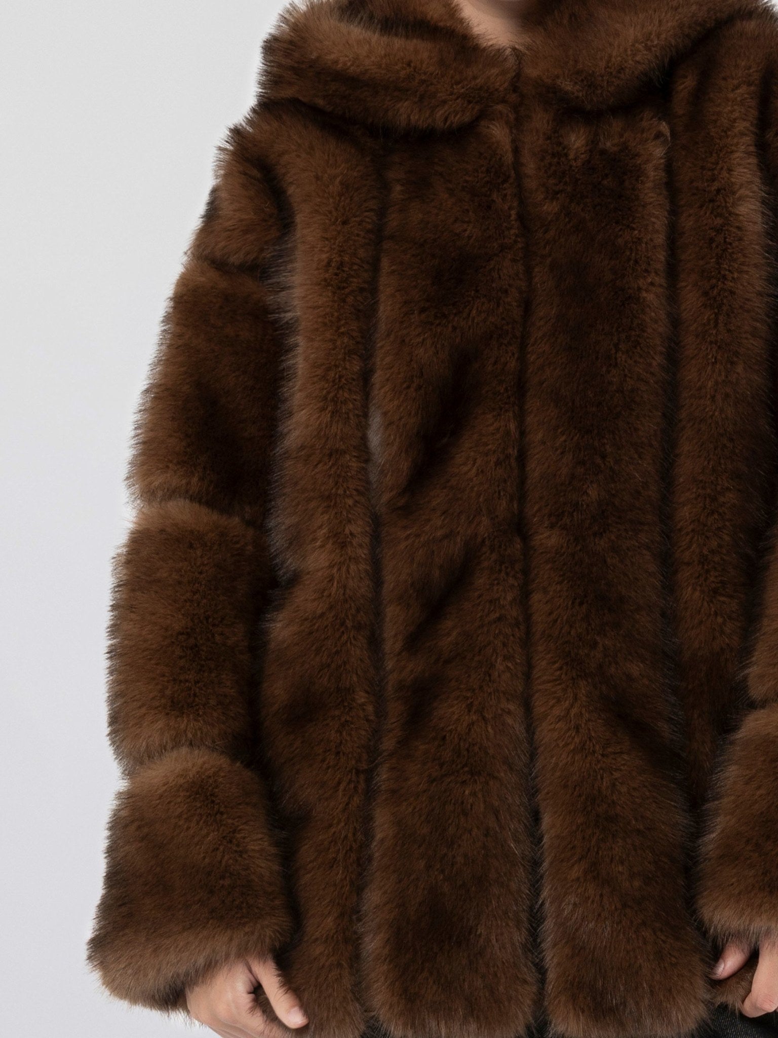 The Casey Faux Fur Jacket is crafted from soft, luxurious faux fur for cozy warmth and a tactile, elegant finish. It features a hood and a seamless hidden closure, offering a sleek, minimalist look. Designed with a relaxed, oversized fit, the jacket falls just above mid-thigh, combining comfort with effortless style.