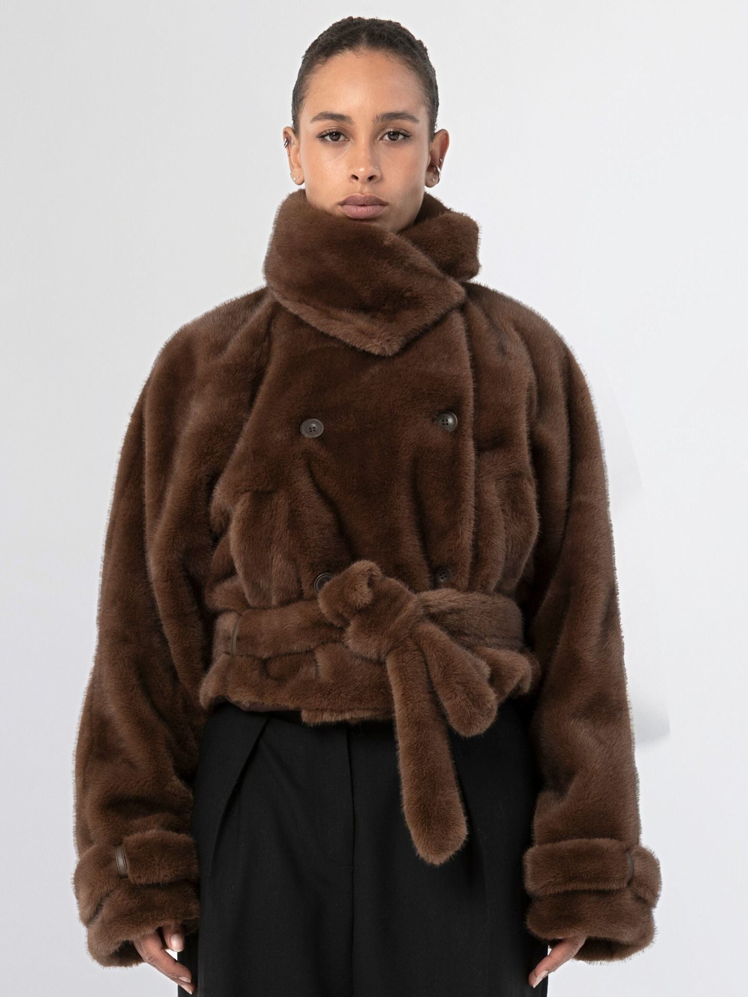 The Atlas Faux Fur Jacket is designed with an oversized silhouette and a striking high collar, creating a bold, statement-ready look. It features a classic button closure, adjustable sleeve straps, and two discreet welt pockets for practical elegance. This style runs large—size down for a closer, tailored fit.