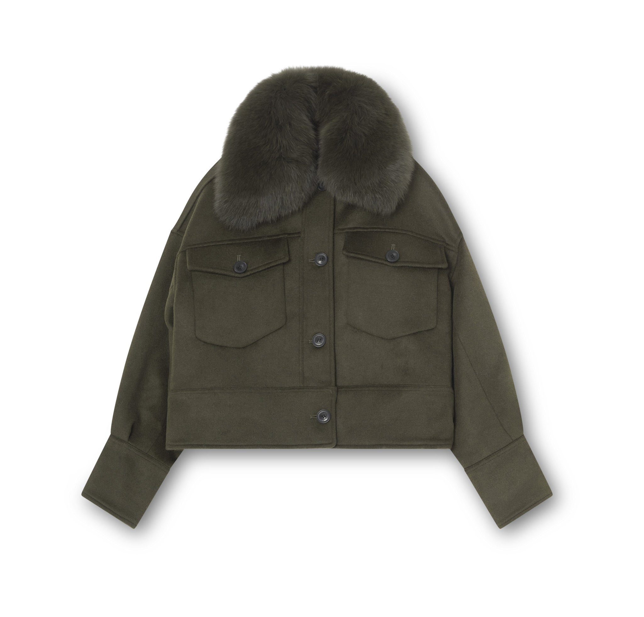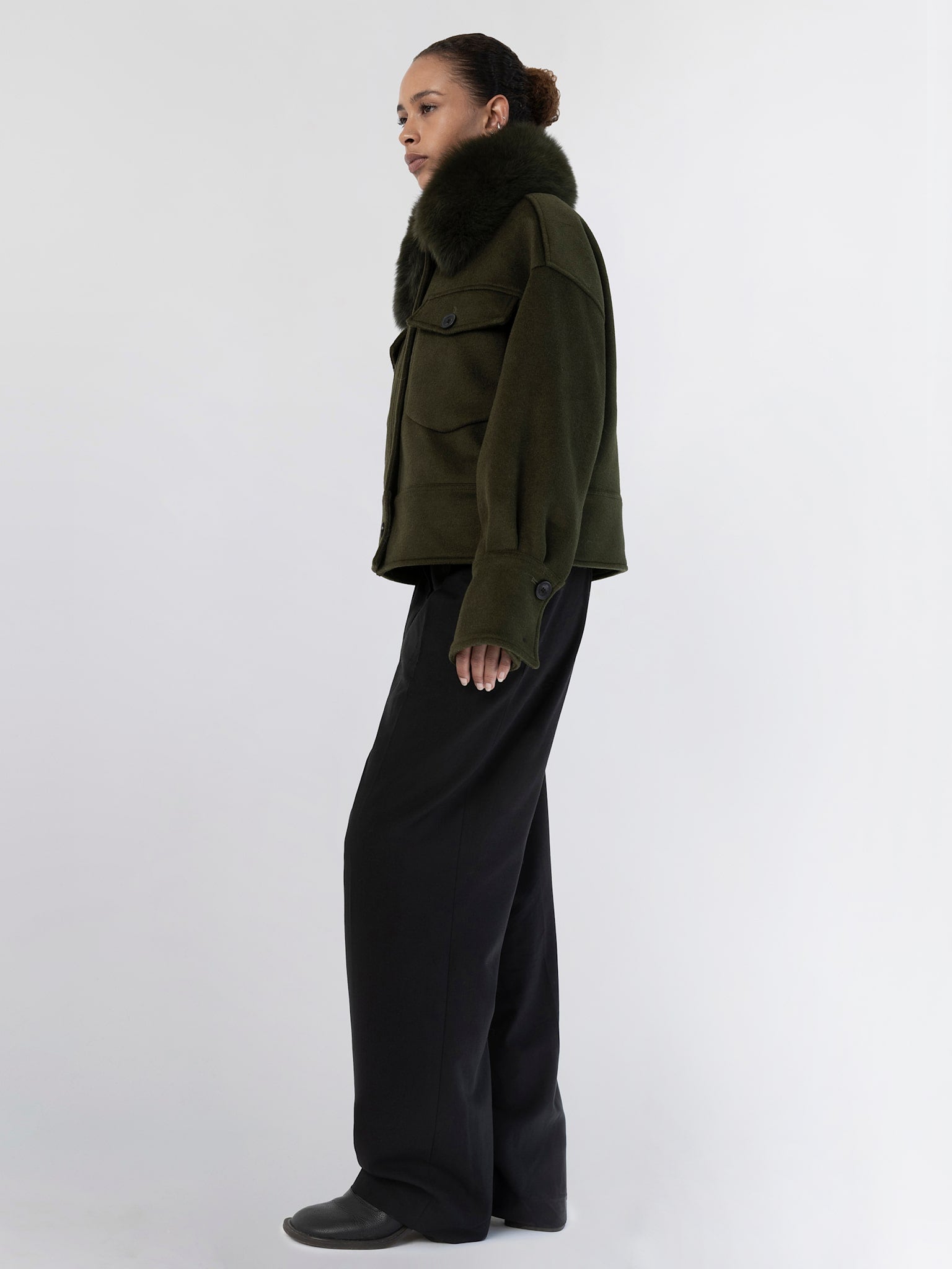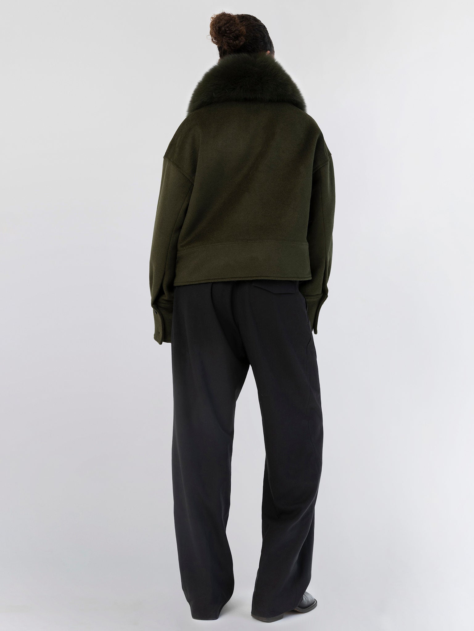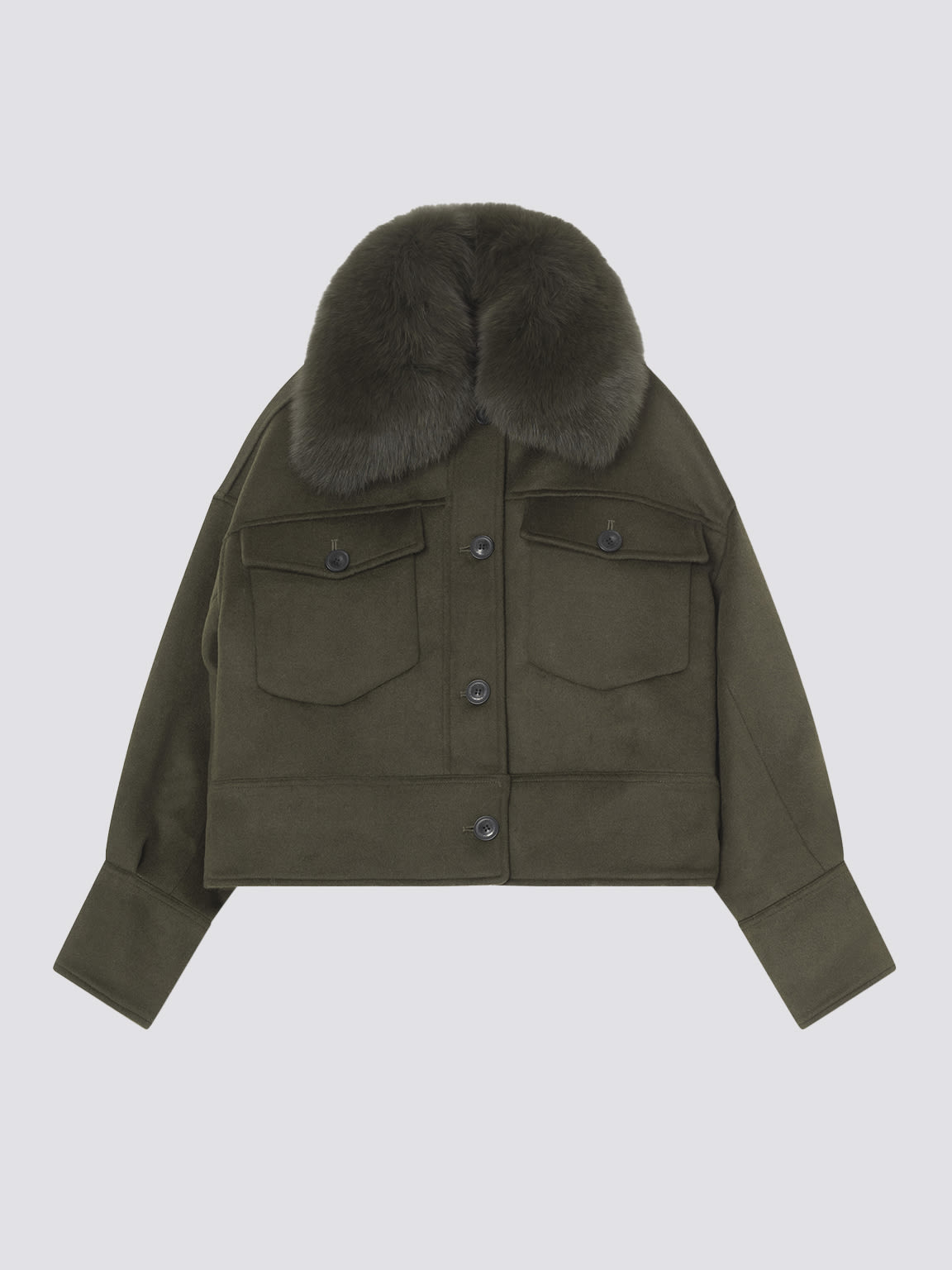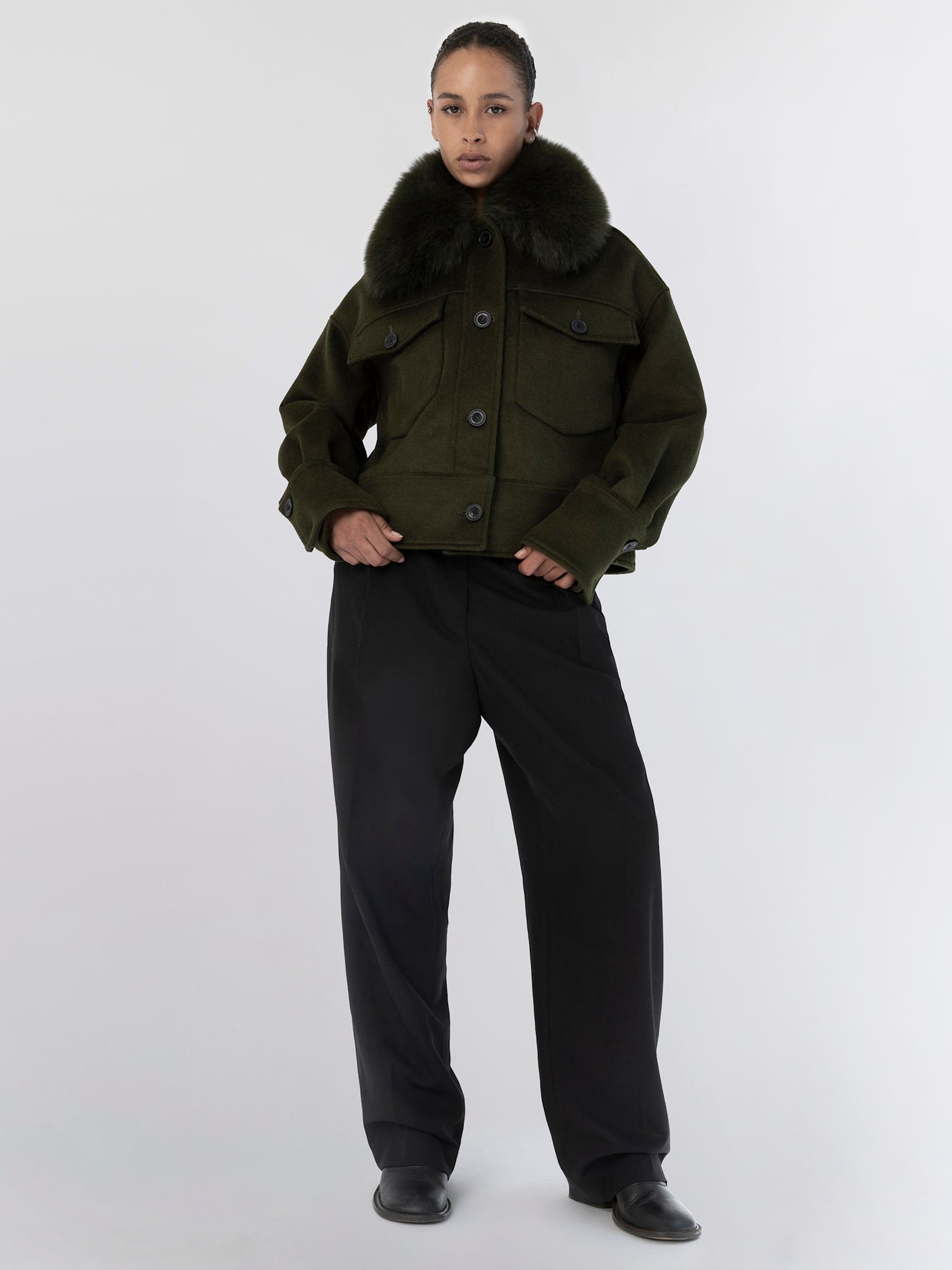 The Charlie wool Jacket is designed with an oversized silhouette, falling around the hips, and a detachable blue fox fur collar. It features flap pockets, a classic button closure, and adjustable sleeve buttons that allow you to roll the sleeves up or down. The model is 175 cm tall and wears size Small.