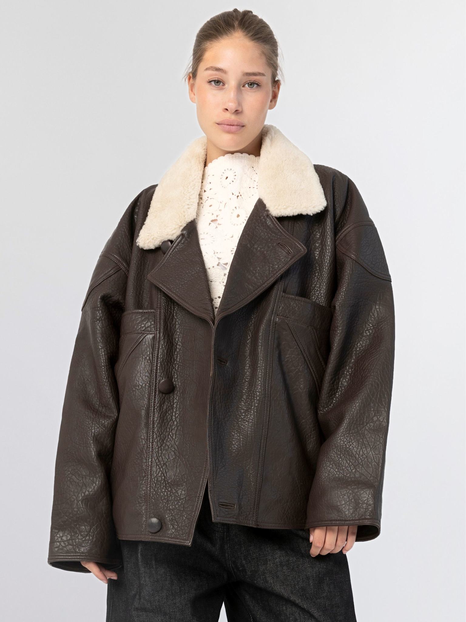 The Venda Leather Jacket features a rich, textured leather finish paired with a soft cream shearling collar for contrast. Designed with an oversized silhouette, it includes angled front pockets and a minimalist snap-button closure, combining effortless style with practical details.