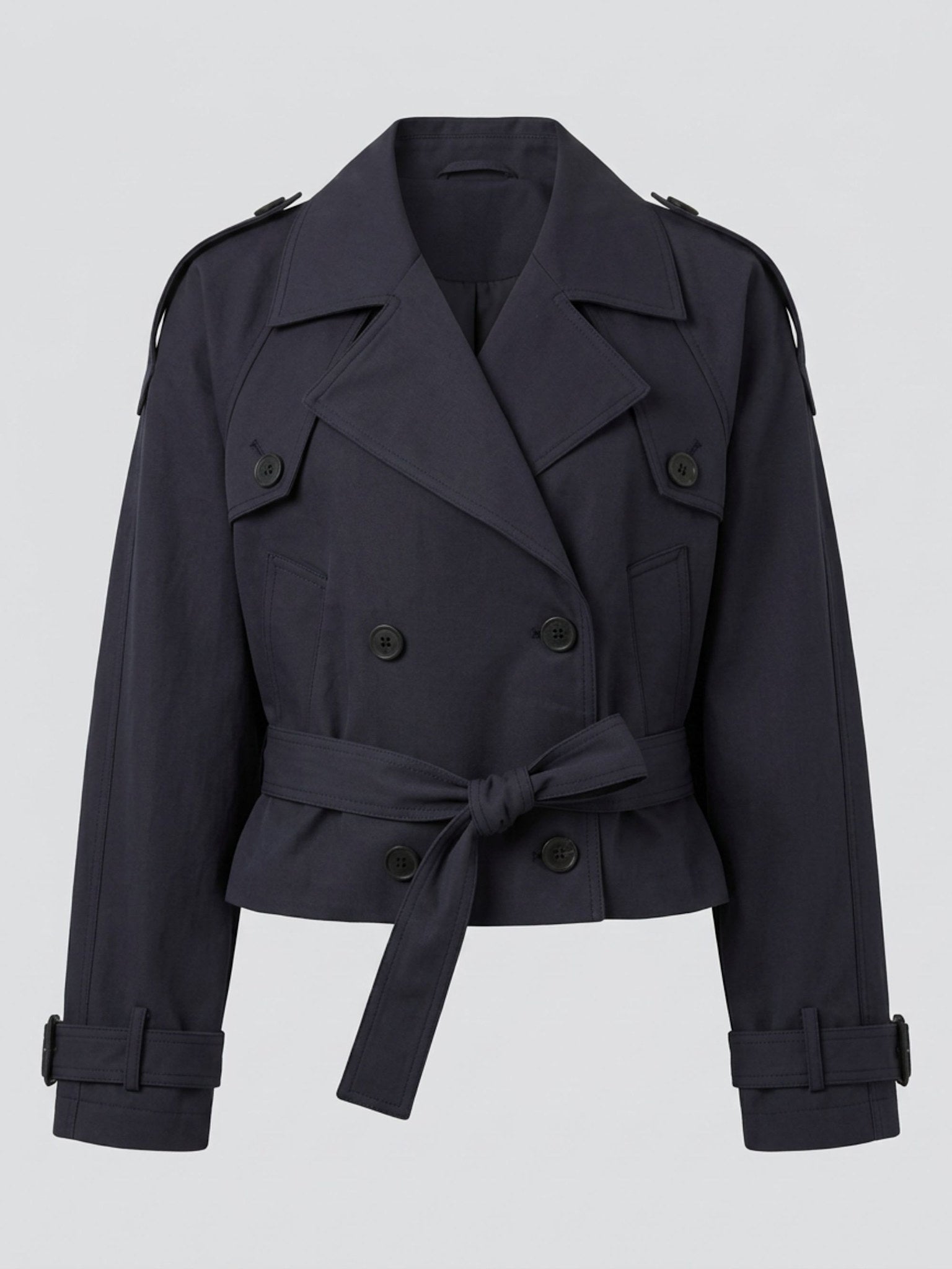 The Short Double-Breasted Canvas Jacket is crafted from water-repellent brown canvas with a lightweight lining for comfort and durability. Designed with a relaxed silhouette, it features two front pockets, button details on the shoulders and cuffs, and comes with an optional belt to cinch the waist for a polished look. The model is 175 cm tall and wears size Small.