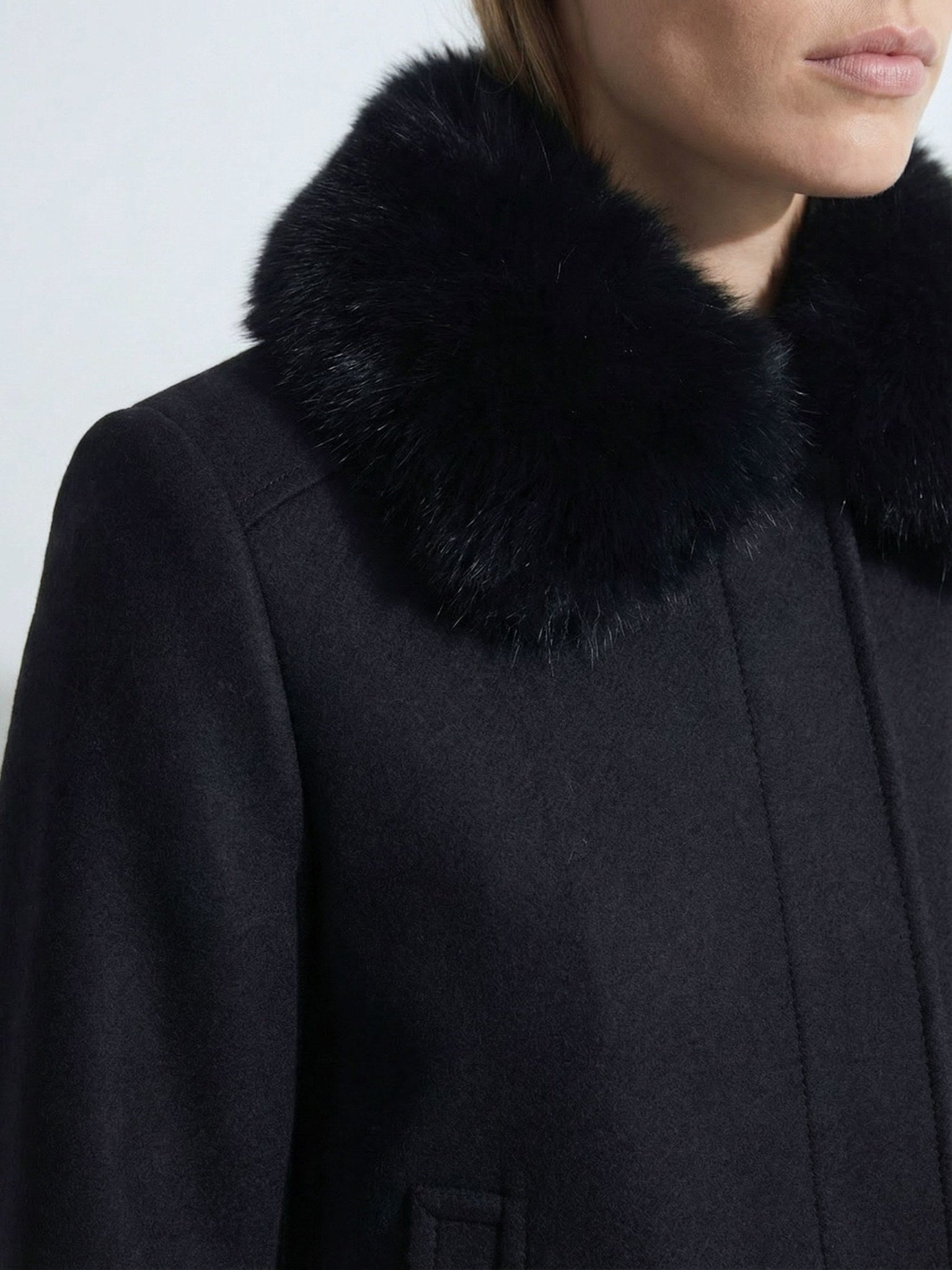 • Wool blend with premium faux fur trim.
