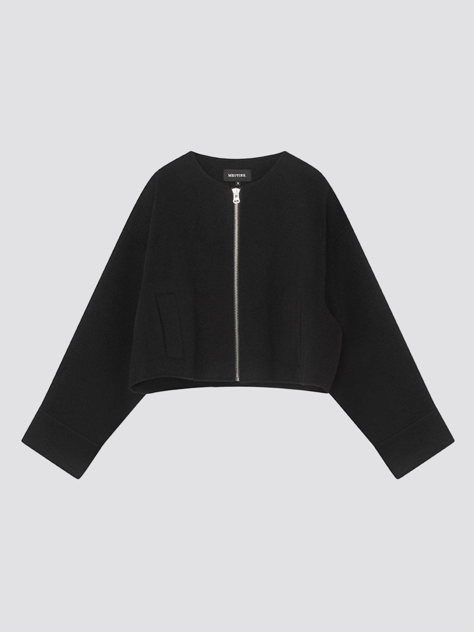 The Karla Cropped Wool Jacket is crafted from a soft wool blend and designed with a modern, cropped silhouette. It features a sleek zip closure, dropped shoulders for a relaxed fit, and two discreet welt pockets, combining effortless style with practical elegance. The model is 175 cm tall and wears size Small.