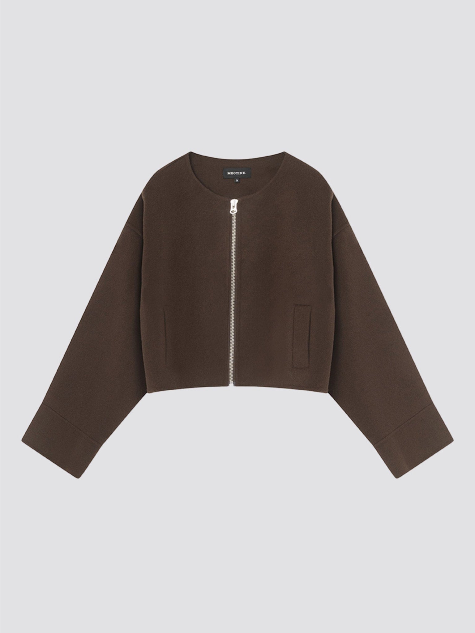 The Karla Cropped Wool Jacket is crafted from a soft wool blend and designed with a modern, cropped silhouette. It features a sleek zip closure, dropped shoulders for a relaxed fit, and two discreet welt pockets, combining effortless style with practical elegance. The model is 175 cm tall and wears size Small.