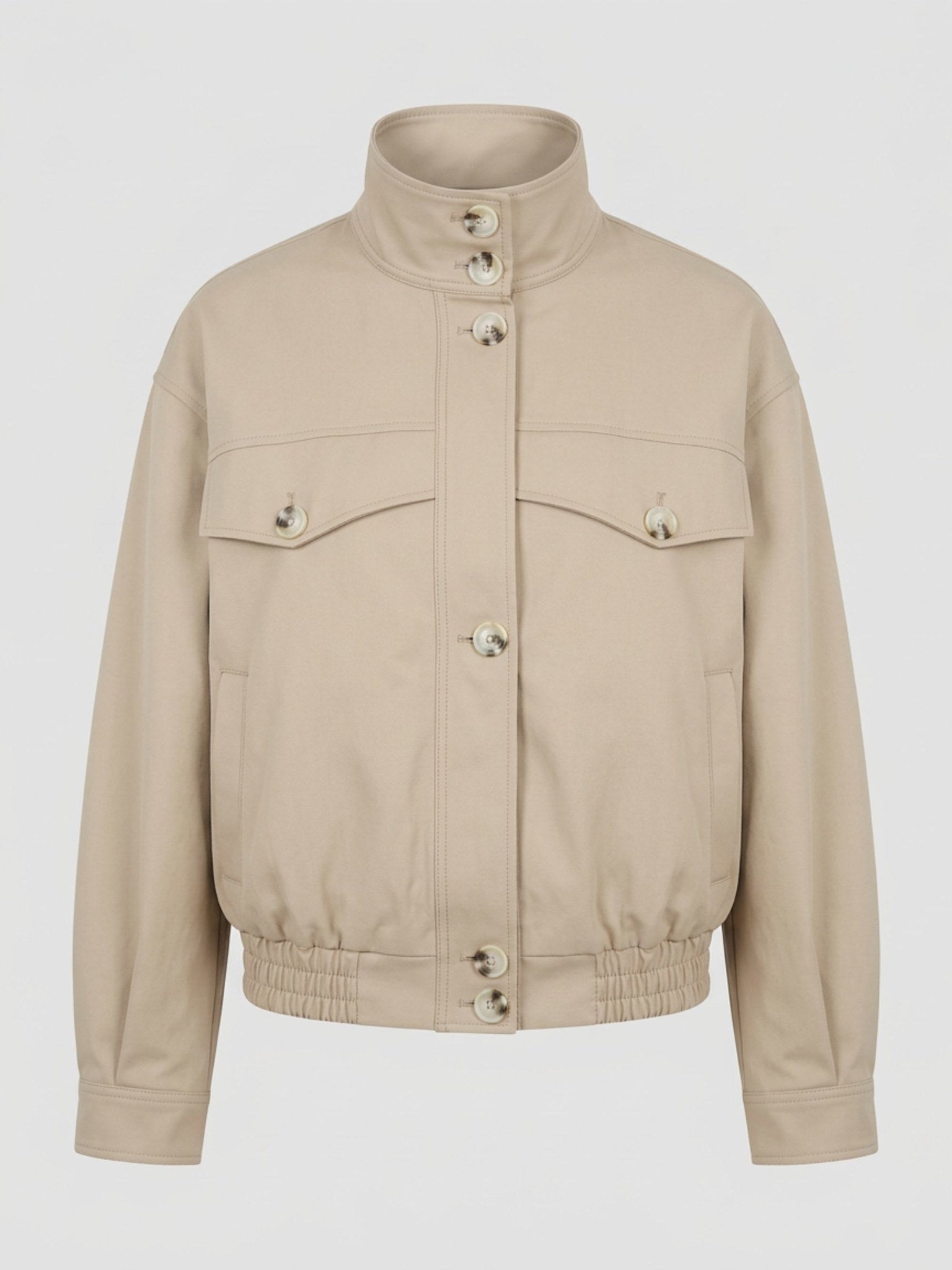 The Nori Bomber Jacket is crafted from structured cotton with a durable, matte finish. Designed in an oversized silhouette with volume through the body and sleeves, it features a high stand collar and a front button closure. Flap chest pockets add subtle utility detailing, while an elasticated hem creates a balanced shape. A modern bomber with a clean, effortless expression.
