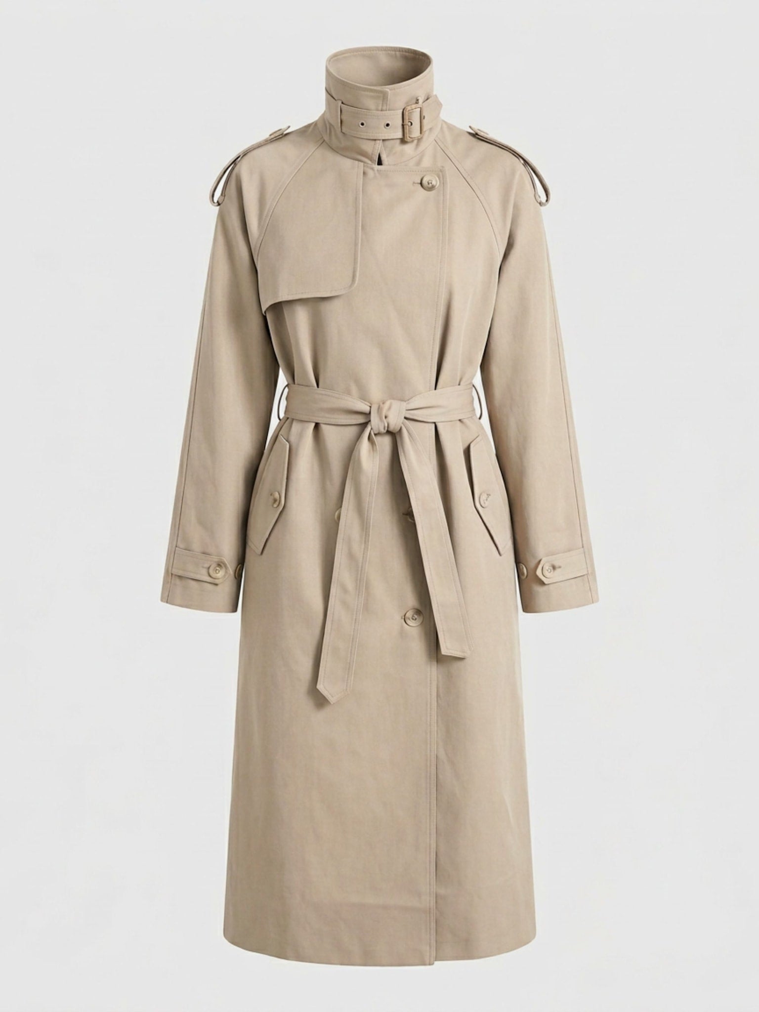 The Heather Trench coat is crafted from a structured, lightweight cotton with a smooth, matte finish. Designed in a long, relaxed silhouette, it features a funnel-neck collar with a buckle fastening and a double-breasted front with button closures. Epaulettes, storm flap detailing, and adjustable cuff straps enhance the utilitarian look, while a detachable belt defines the waist. A modern interpretation of the timeless trench.