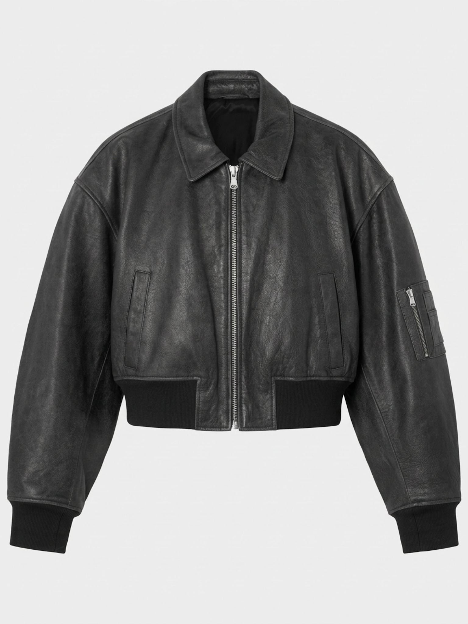 Bonnie is a cropped oversized leather bomber. The jacket is cut from a vintage inspired leather finish and features a ripped waistline and cuffs, two front pockets, zipper closure and a collar. As the jacket is designed to exude a vintage vibe, there will be small imperfections in the leather, which contribute to its unique look.
