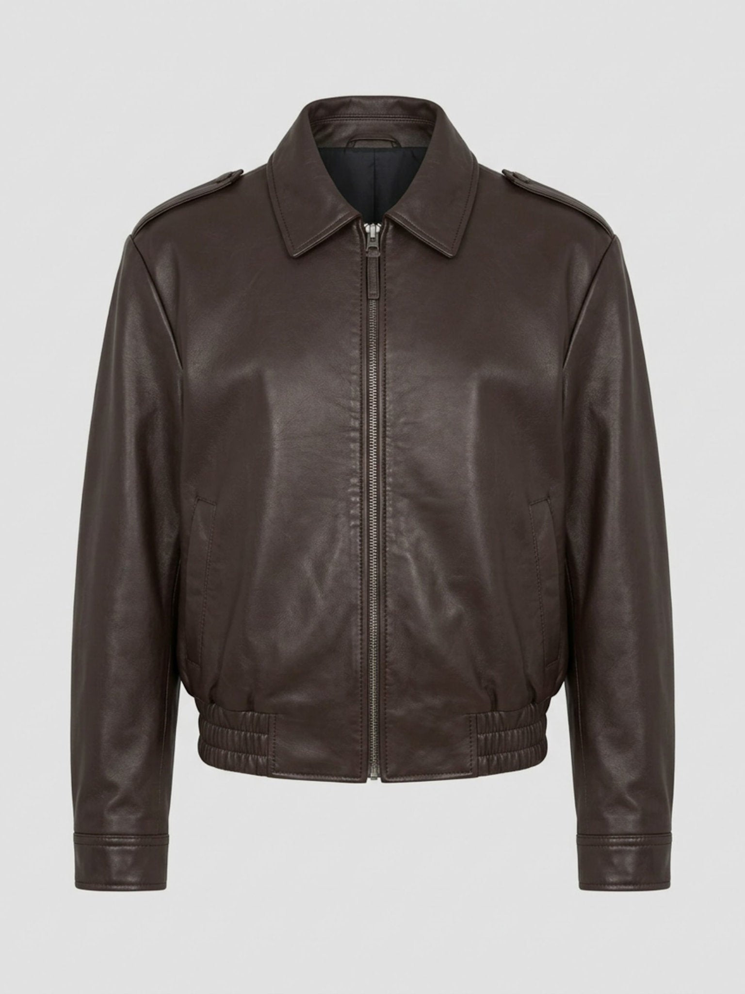 The Cleo Jacket is crafted from fully lined, 100% soft leather, making it a perfect choice for transitional seasons. It features a metal zipper closure, shoulder epaulettes, zipper details on the sleeves, and a ribbed waistband that nods to the classic bomber jacket style. Cut for a boxy, relaxed fit, the jacket runs true to size. For a more tailored look, we recommend sizing down.