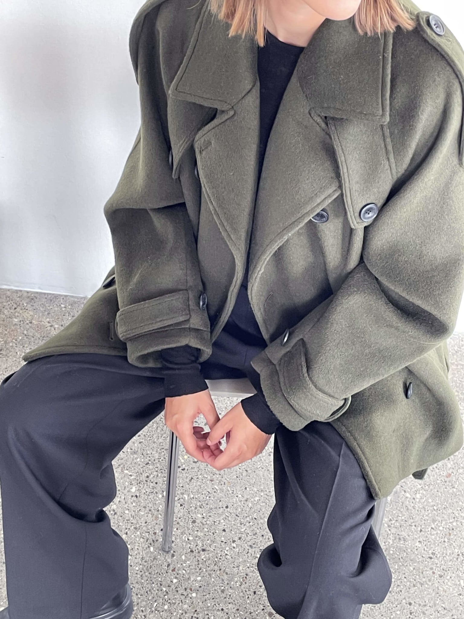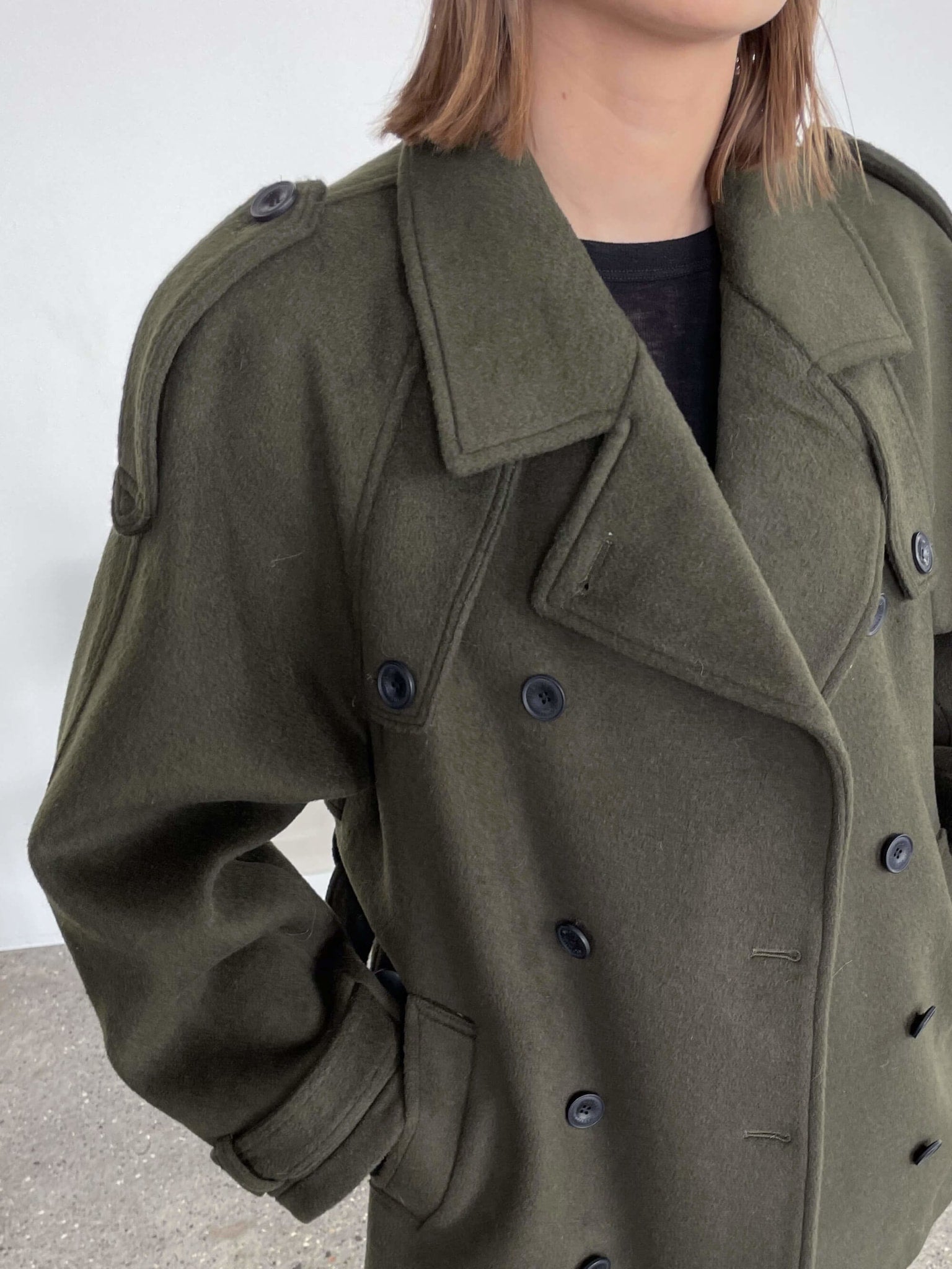 Our iconic Bea Jacket is crafted in a wool and polyester fabrication blend and features a double-breasted closure, lapel collar, sleeve straps, shoulder epaulettes, storm flap at the back and two welt pockets. Bea Coat comes with a belt to highlight the waist or wear it open for a more casual look. The coat is cut for an oversized, relaxed fit and is true to size. We recommend sizing down if a closer fit is preferred.