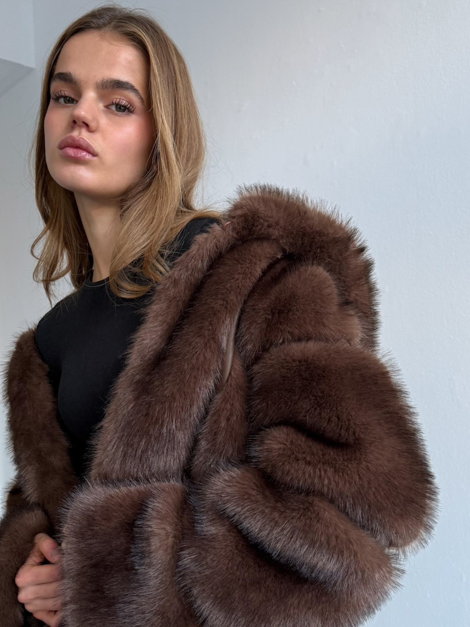 • MEOTINE: En luksuriøs brun pelsjakke med hette, kombinert med stilige, vide bukser.