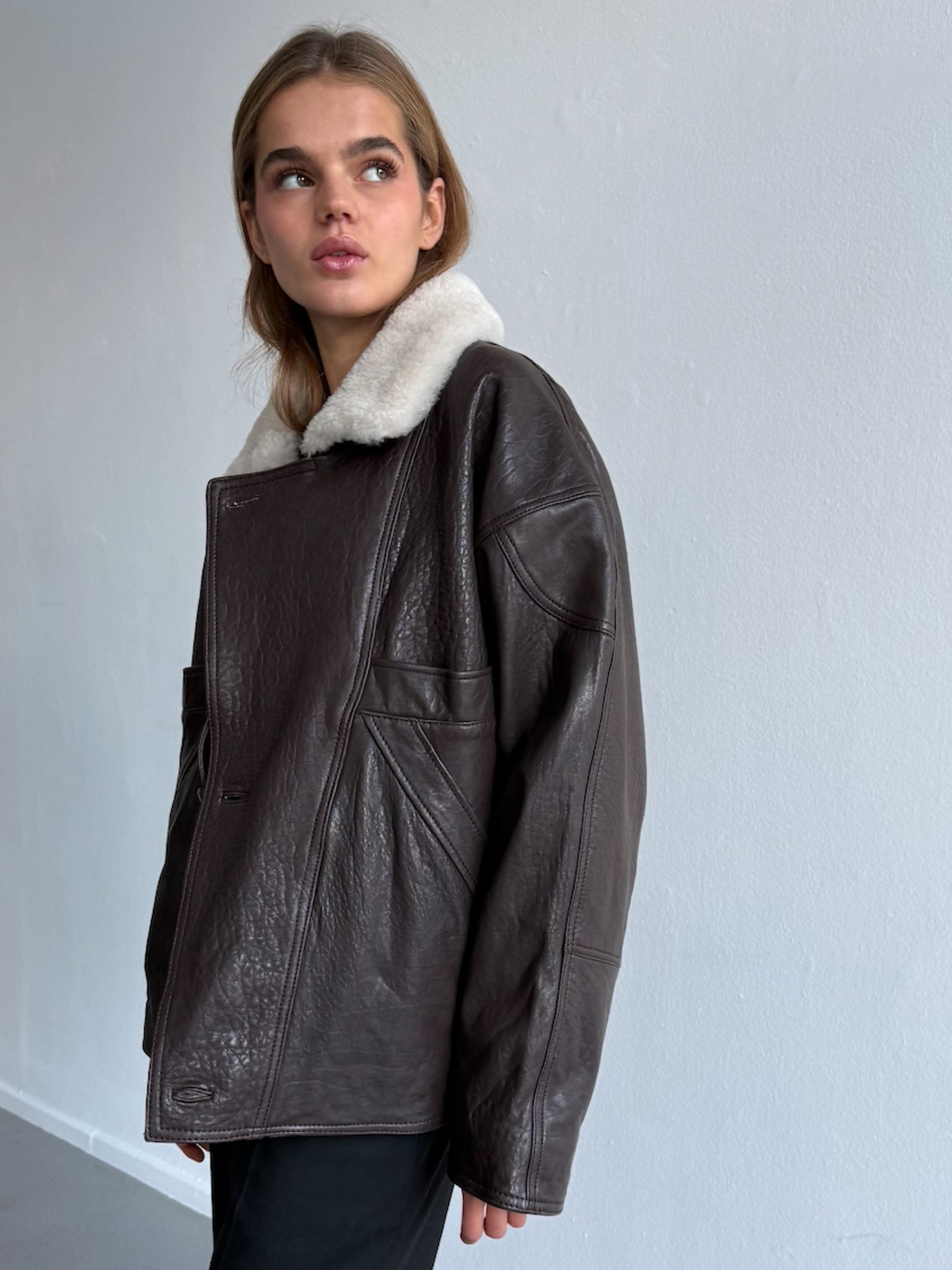 The Venda Leather Jacket features a rich, textured leather finish paired with a soft cream shearling collar for contrast. Designed with an oversized silhouette, it includes angled front pockets and a minimalist snap-button closure, combining effortless style with practical details.